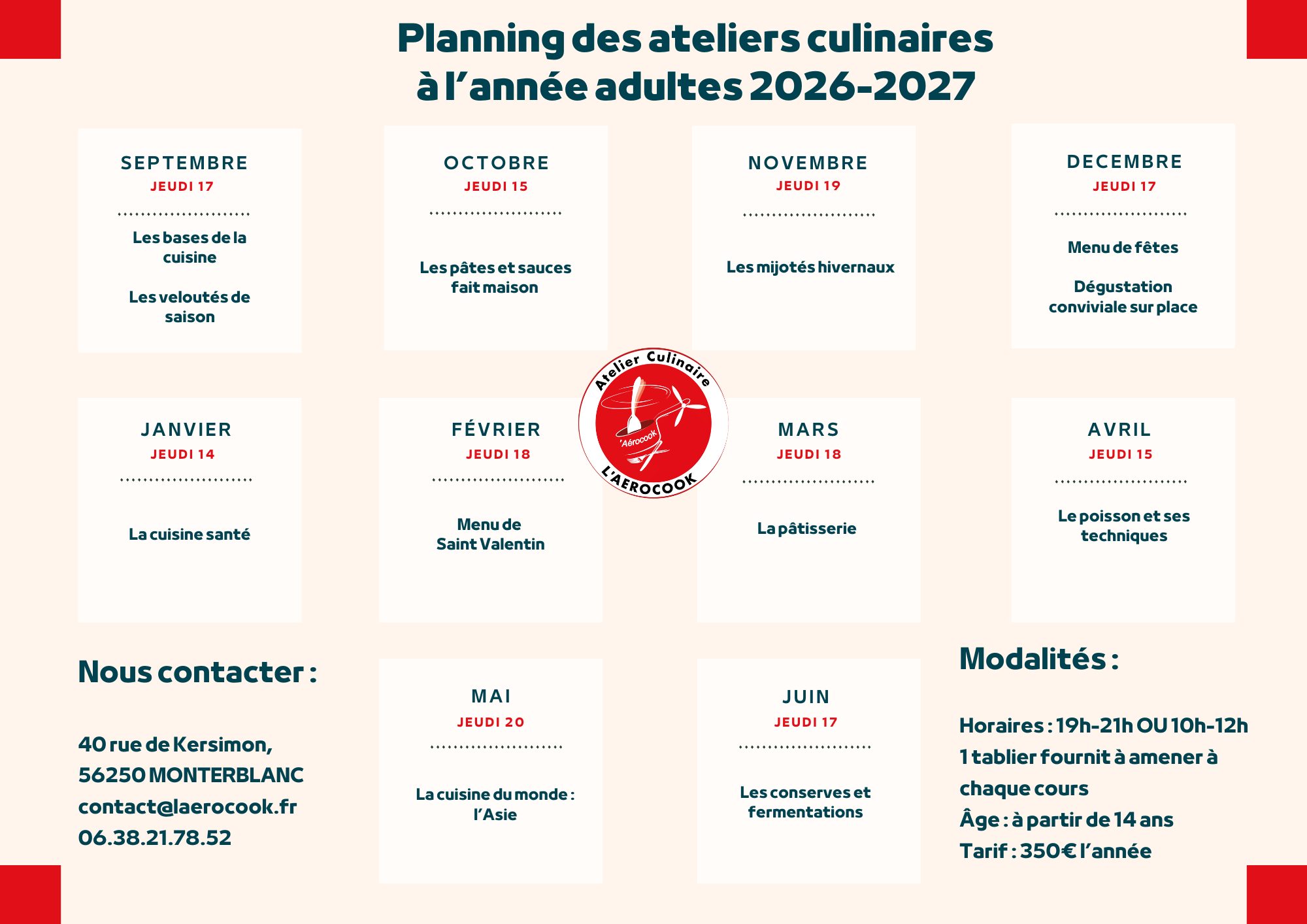 Ouverts à tous dès 14 ans, ces ateliers sont l’occasion parfaite pour apprendre, se perfectionner ou simplement partager un bon moment autour des fourneaux 👨🍳.